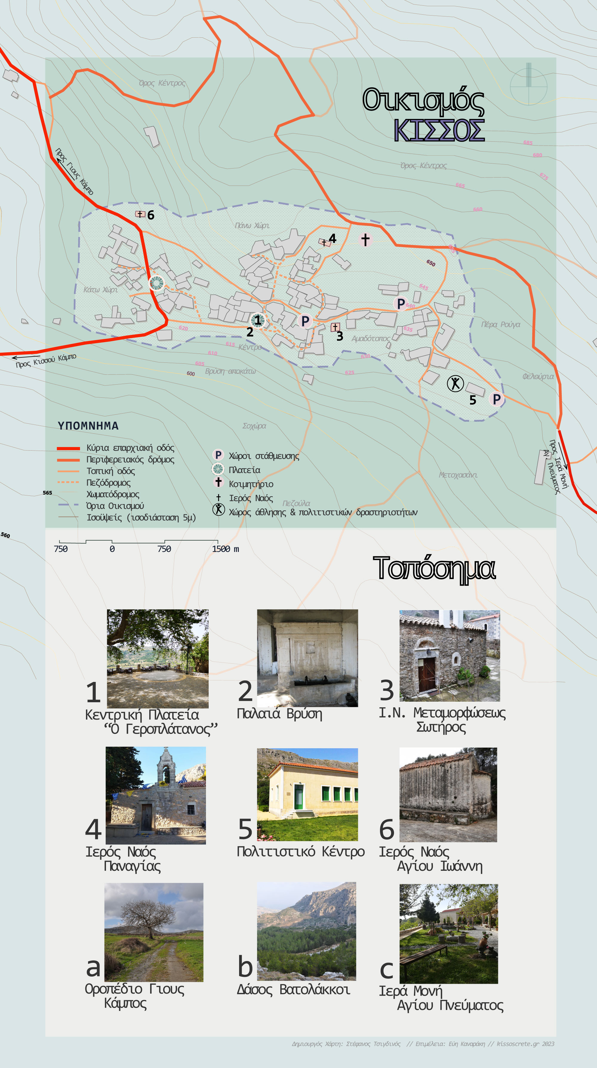Το οροπέδιο Γιους Κάμπος, η παλαιά βρύση του χωριού, το πλέον ανακαινισμένο σχολείο και το πευκόδασος στους Βατολάκους είναι μερικά απο τα αξιοθέατα της ευρύτερης περιοχής του Κισσού.