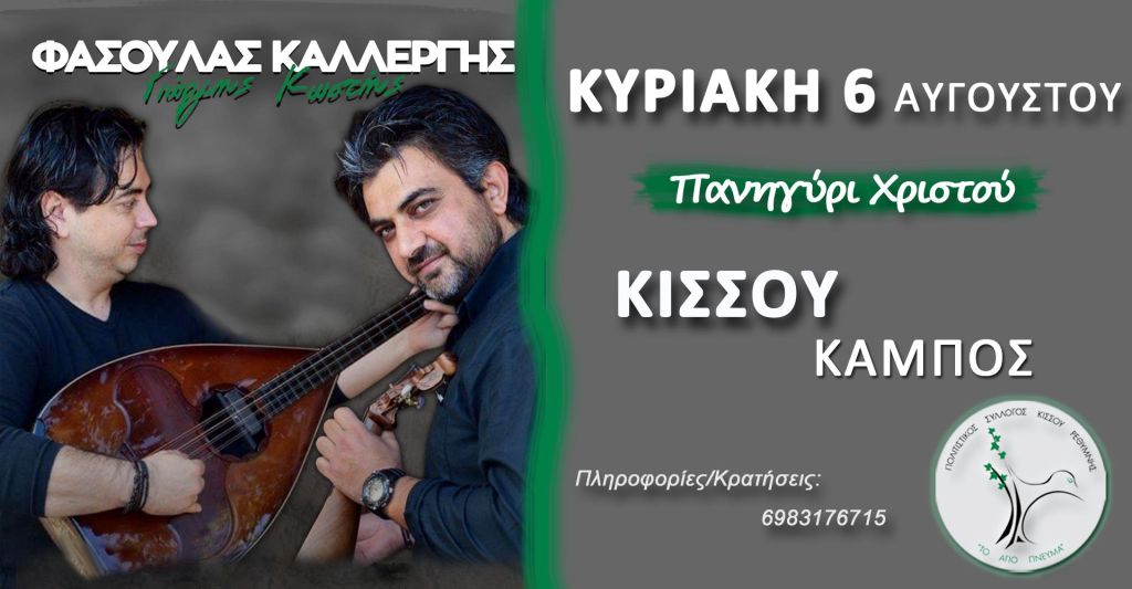 Ο Πολιτιστικός Σύλλογος Κισσού Ρεθύμνης σας προσκαλεί στο Πανηγύρι του Χριστού την Κυριακή 6 Αυγούστου στον Κάμπο του Κισσού. Η εκδήλωση θα πραγματοποιηθεί στον χώρο μπροστά από τον Ιερό Ναό του Αγίου Βασιλείου. Θα μας διασκεδάσουν ο Γιώργης Φασουλάς και ο Κώστας Καλλέργης με το συγκρότημα τους.